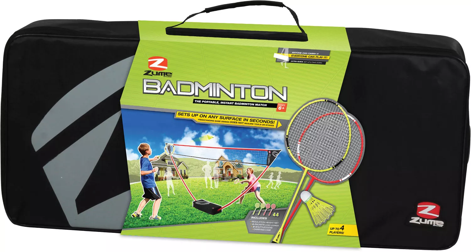 Get competitive at your next outdoor party with the Zume Games® Badminton Set. Perfect for backyard bashes or beach parties, this badminton set is highly portable and easy to set up anywhere. Featuring a regulation height net, it can be set up on any surface without tools or stakes. It’s equipped with 4 rackets for doubles or singles play. The 2 shuttlecocks ensure that you’ll always be ready to play. Take it on-the-go in its carrying case.